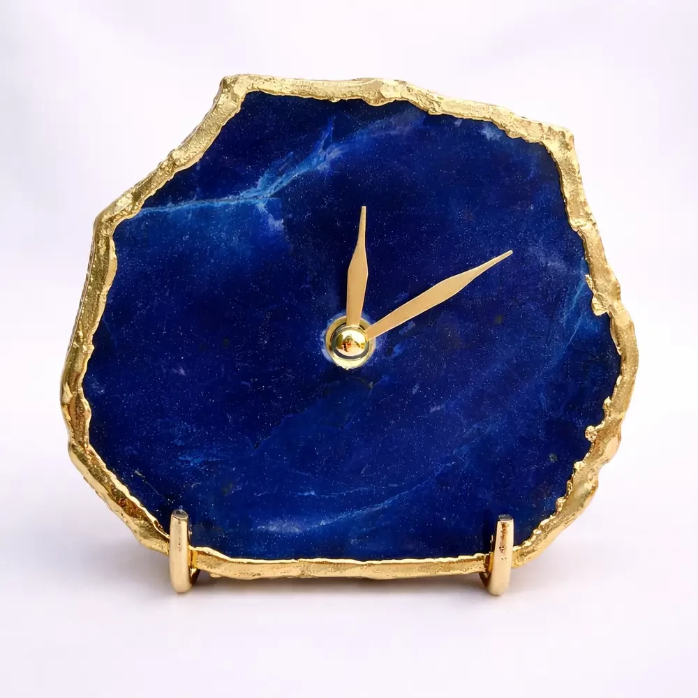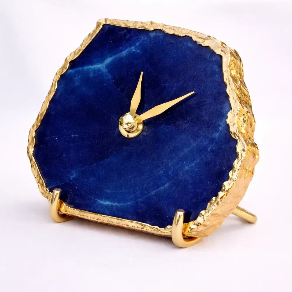 Premium blue agate clock crafted from natural stone with electroplated metallic edges. Can be used as a desk or wall clock and personalized for gifting. A unique luxury decor piece with worldwide shipping available.