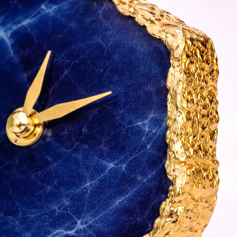 is a luxurious blend of natural stone beauty and modern craftsmanship. Made from thick, irregular-shaped agate quartz slabs, each piece features stunning blue patterns, ensuring every clock is completely unique and eye-catching.