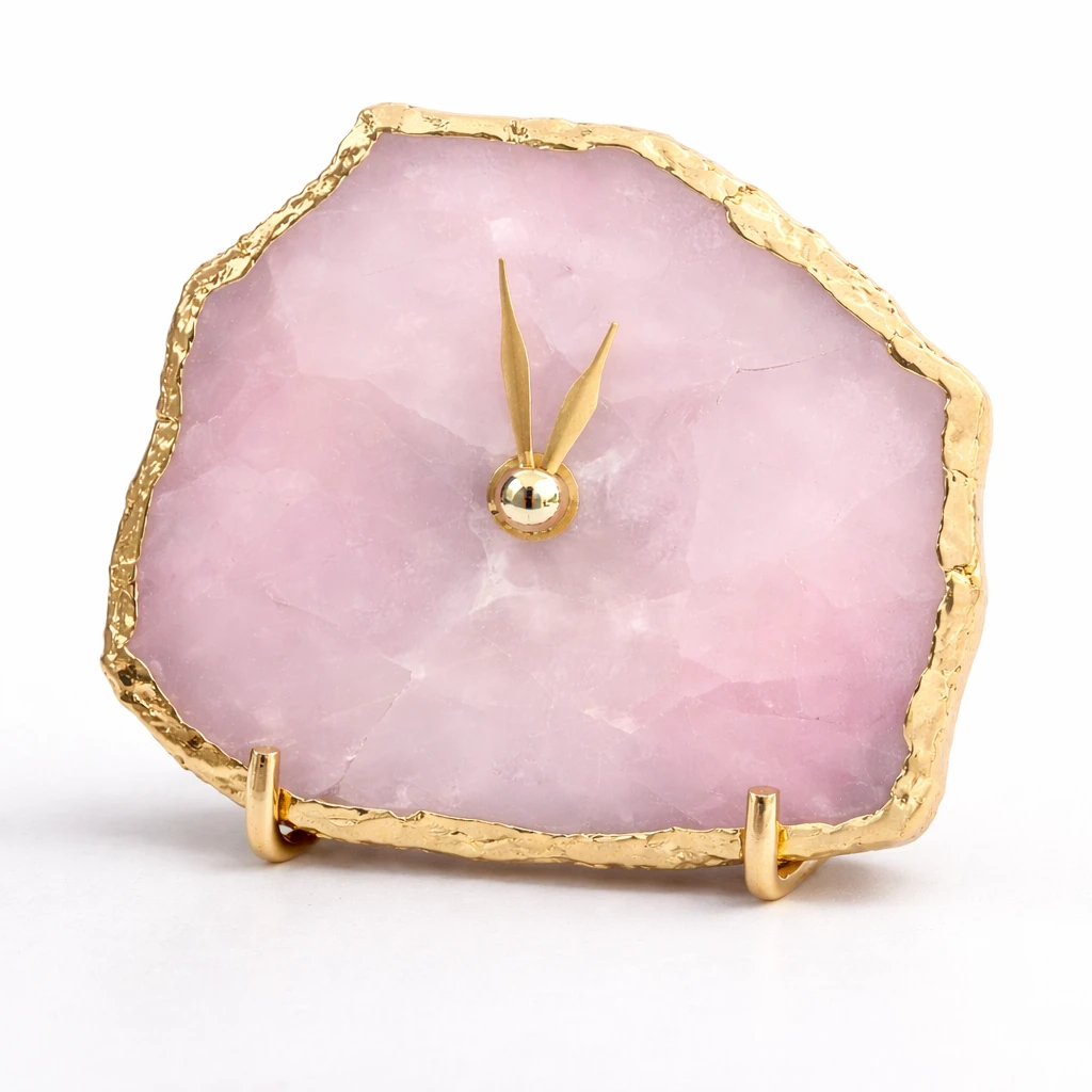 Elegant rose quartz agate clock crafted from natural stone with premium electroplated edges. Can be used as a desk or wall clock and personalized for gifting. A perfect luxury decor piece with worldwide shipping available.