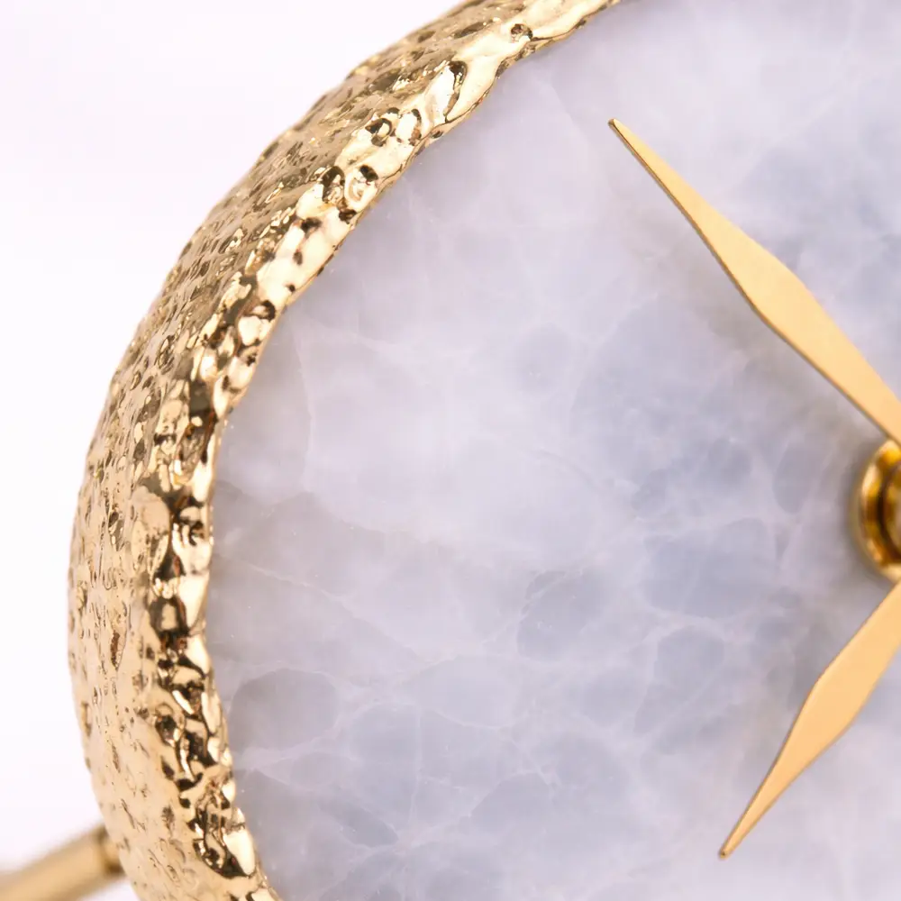 Elegant white agate clock crafted from natural stone with a clean, premium look and electroplated metallic edges. Suitable for both desk and wall use, this luxury decor piece adds a minimal and sophisticated touch to any space. Worldwide shipping available.