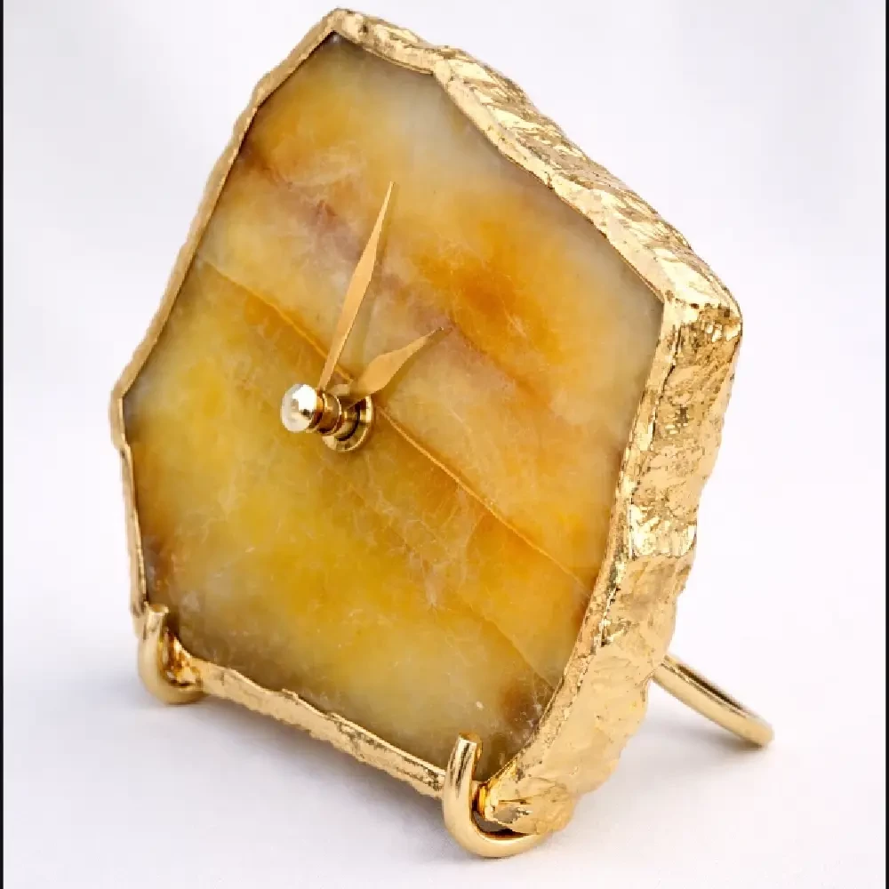 Elegant yellow agate clock crafted from natural stone with premium electroplated metallic edges. Can be used as a desk or wall clock and personalised for gifting. A unique luxury decor piece with worldwide shipping available