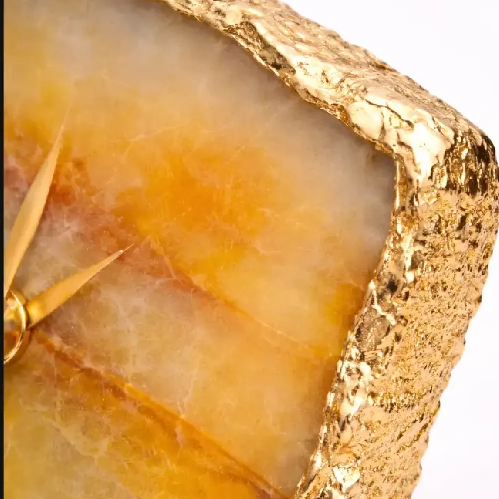 is a perfect combination of natural beauty and modern luxury. Crafted from thick, irregular-shaped agate quartz slabs, each clock features vibrant yellow tones and unique patterns, making every piece one-of-a-kind.